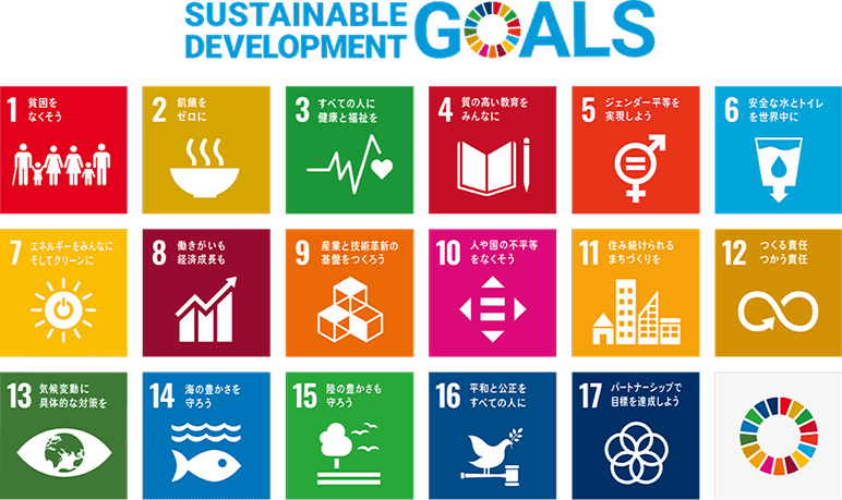 持続可能な開発目標(SDGs:Sustainable Development Goals)とは、2001年に策定されたミレニアム開発目標(MDGs)の後継として、2015年9月の国連サミットで加盟国の全会一致で採択された「持続可能な開発のための2030アジェンダ」に記載された、2030年までに持続可能でよりよい世界を目指す国際目標です。17のゴール・169のターゲットから構成され、地球上の「誰一人取り残さない(leave no one behind)」ことを誓っています。SDGsは発展途上国のみならず、先進国自身が取り組むユニバーサル(普遍的)なものであり、日本としても積極的に取り組んでいます。