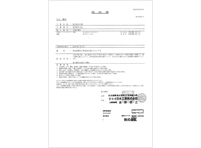 完成・引渡し時に、材料メーカーとの連名保証書を、ご提出いたします。(保証対象工事)