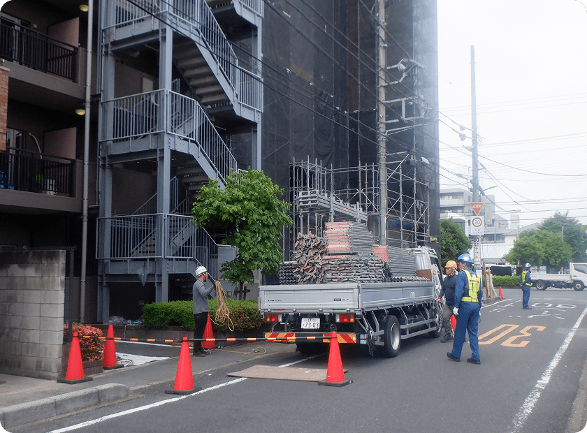 足場資材の搬入・搬出時には、通勤・通学路にガードマンを配置し、皆様の安全をお守りいたします。
